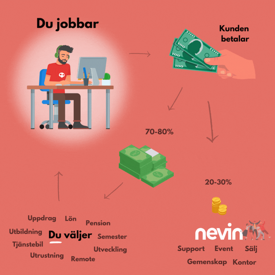 Vår kompensationsmodell bygger på att ge så mycket som möjligt tillbaka till dig. Av det vi fakturerar till kund får du mellan 70 och 80% tillbaka in på ditt Nevin-konto. De pengarna bestämmer du sen själv över.